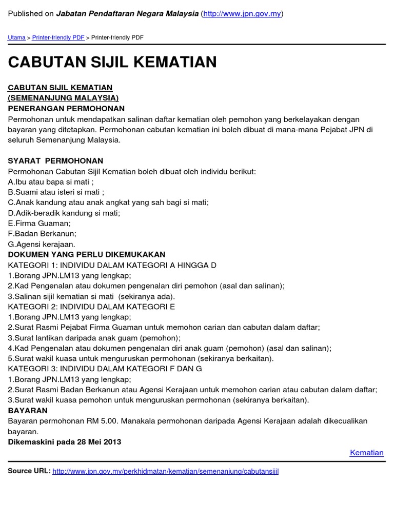 A Ibu Bapa Sijil Lahir Penerima b Pasangan Sijil Nikah Sijil Perkahwinan Sijil Lahir Anak c Anak Sijil Lahir Wakil. Sijil Kematian Penama 20 PERHATIAN DAN MAKLUMAN KEPADA PEMOHON 21 KWSP berhak meminta apa-apa dokumen tambahan sekiranya diperlukan dan berhak menolak mana-mana permohonan yang tidak lengkap dan tidak memenuhi syarat yang ditetapkan. Surat Rasmi dari Badan Berkanun atau Agensi Kerajaan untuk memohon carian cabutan dalam daftar kematian asal.