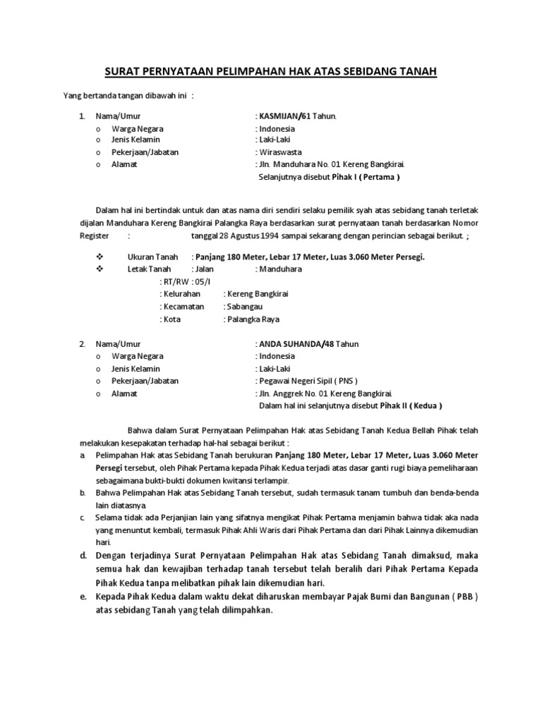 Silahkan download file contoh surat pernyataan pengalihan hak atas sebidang tanah tersebut. Surat perjanjian pengalihan hak atas tanah. Contoh Surat Kuasa Pengalihan Hak Milik Silahkan kunjungi artikel kami sebelumnya yaitu contoh surat pernyataan skck surat keterangan catatan.