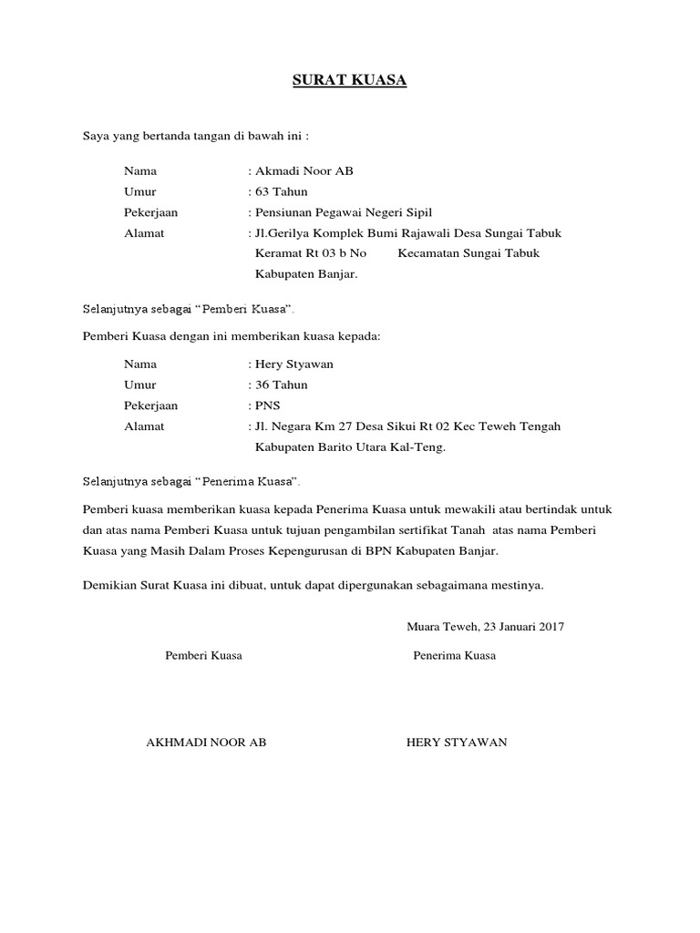3 Pihak penerima kuasa sudah berumur 17 tahun ke atas atau dewasa. Fotokopi identitas pemohon ktp. Lantas kira kira seperti apa contoh surat kuasa pengambilan sertifikat tanah dibank yang benar.