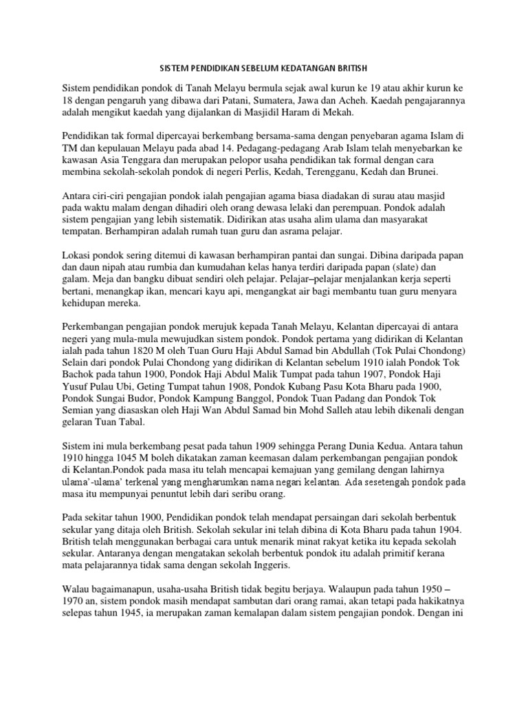 Bincangkan peranan golongan pembesar di Vietnam dan Burma sebelum kedatangan baratPengenalan Sistem pembesar di Myanmar dan Vietnam diwujudkan membantu raja dalam pemerintahanGolongan ini menduduki lapisan kedua selepas raja dalam sistem feudalPembesar ini mempunyai kuasa terhad dan sentiasa diawasi oleh pihak istanaIsi-isi Sistem Pembesar Di Vietnam Sebelum kedatangan. Sebelum kedatangan kuasa penjajah pendidikan di Tanah Melayu berbentuk bukan formal dan tidak memberatkan perkembangan kongnitif pe1ajar-pelajar. Corak pendidikan yang ada pada ketika itu berjalan seperti biasa dengan pengajaran al-Quran tingkah laku dan akhlak yang baik pengetahuan kerohanian dan seni mempertahankan diri.