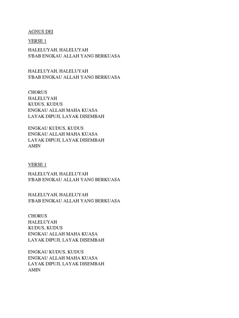 Lebih baru Lebih lama Related Posts. Bangsa Bangsa Bagi KemuliaanMu. Lirik lagu rohani agnus dei haleluyah haleluyah sbab engkau allah yang berkuasa haleluyah haleluyah sbab engkau allah yang berkuasa haleluyah haleluyah kudus kudus engkau allah maha kuasa layak dipuji layak disembah sbab engkau kudus kudus engkau allah maha kuasa layak dipuji layak disembah amin holy holy are you lord god almighty worthy is the lamb worthy is the lamb you are holy.